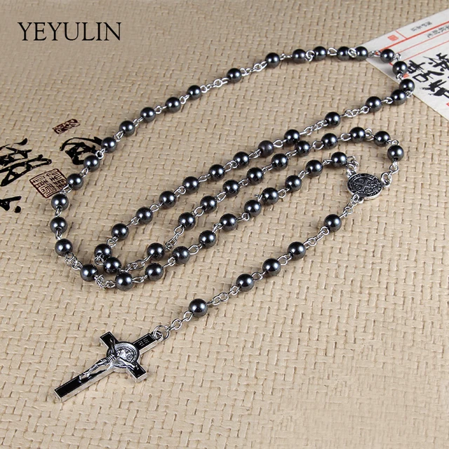 Black Stone Beads St.Benedict Rosary Necklace
